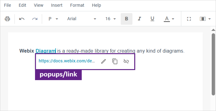 - "popups/link" - the popup view with link settings