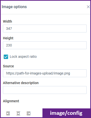 - "image/config" - the panel with detailed image settings which appears on click of the "Edit image" button of the image popup